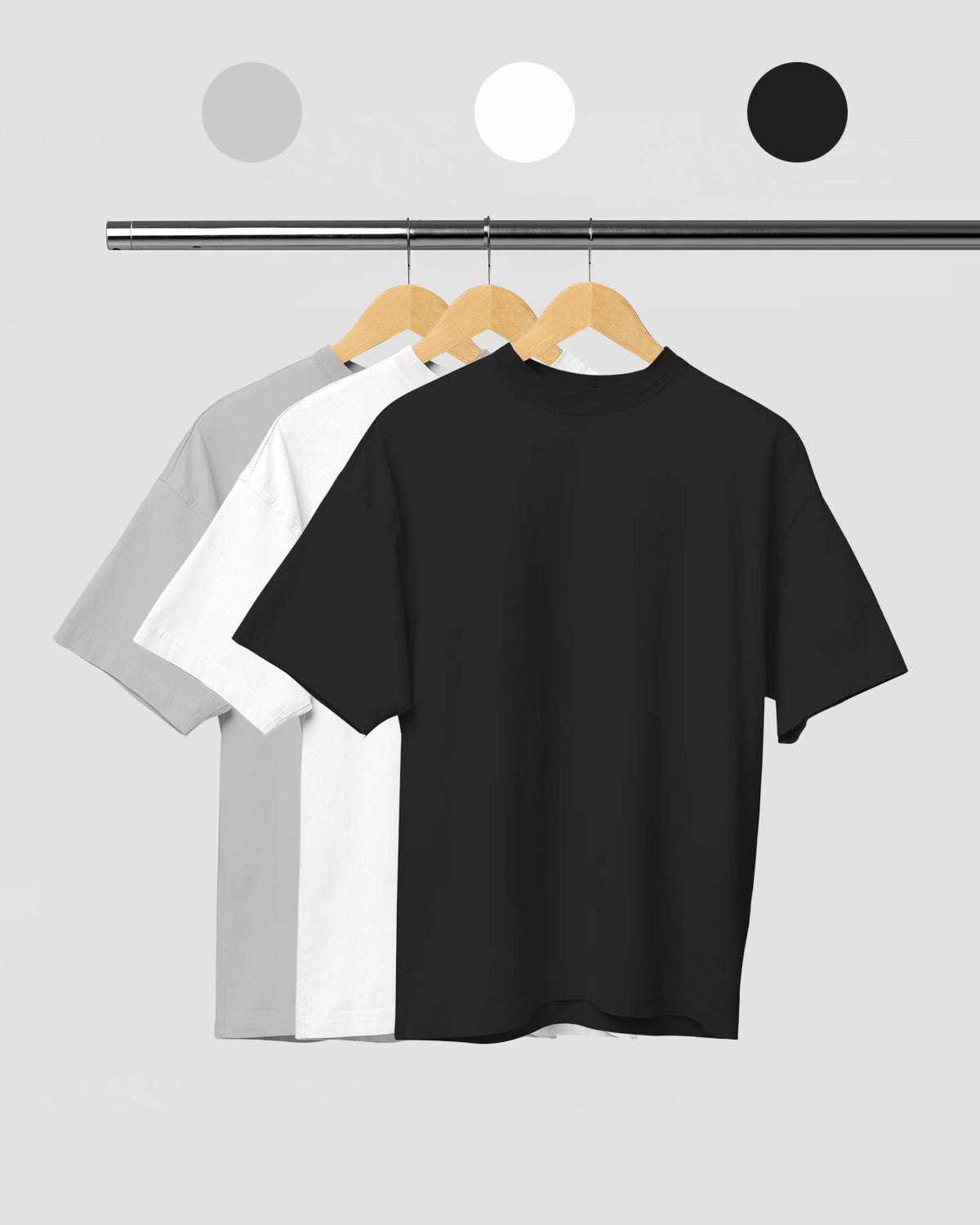 Pack of 3 Premium Oversized Unisex T-Shirts –Ash Grey, White, Black