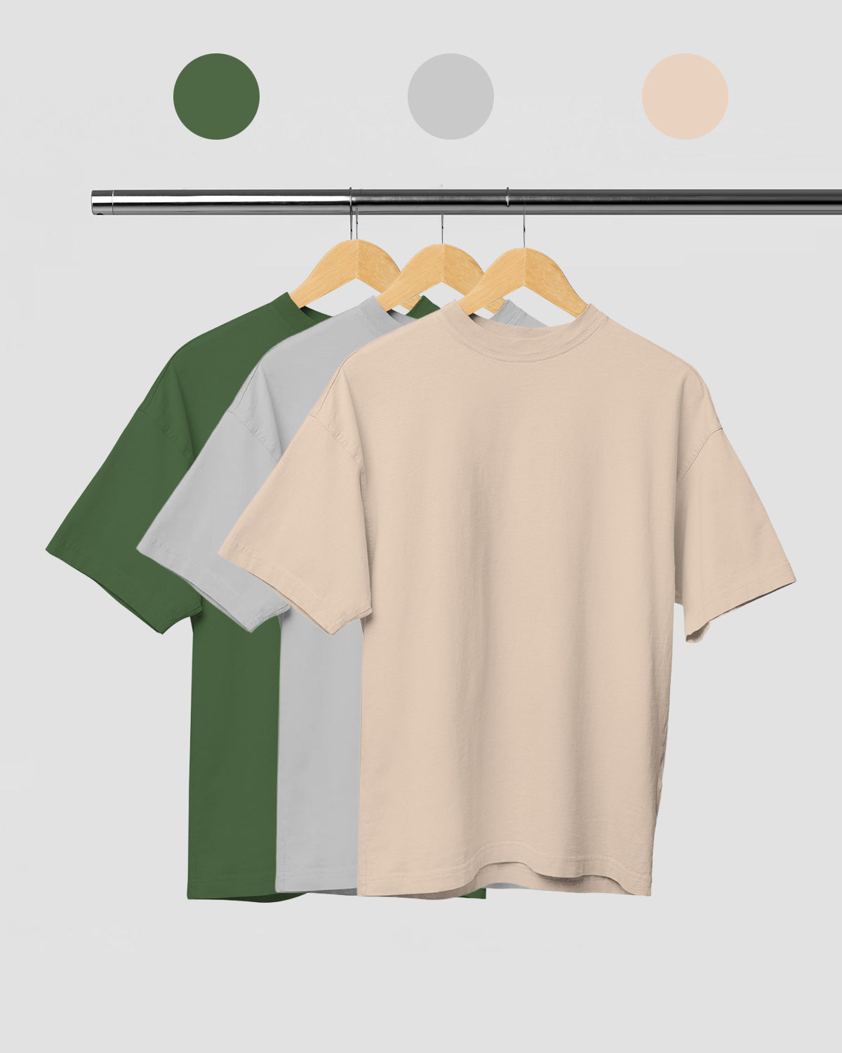 Pack of 3 Premium Oversized Unisex T-Shirts –Military Green, Ash Grey, Beige